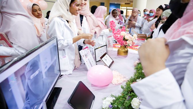 On October 17, 2023, the Nursing Program collaborated with King Abdullah Medical Complex Hospital to organize an awareness campaign at the BMC main lobby. The campaign aimed to provide brief information about breast cancer symptoms and the recommended age for mammograms. Interactive sessions were conducted to engage the audience with questions to test their knowledge. Gifts were distributed to participants, and a social media video featuring students standing in the shape of a ribbon was created.